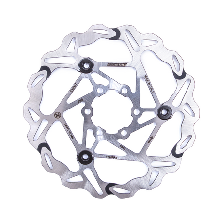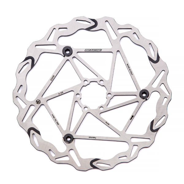 DISCO NON TONDO SEMIFLOTTANTE A 3 NOTTOLINI Grazie all?esperienza acquisita da BRAKING© nei campionati del mondo motocross, è nato il nuovo design semiflottante per il mondo bici racing. Prestazione costante in ogni condizione. Perch‚ semiflottante? Offre il miglior compromesso tra deformazioni (grazie al meccanismo) e resistenza agli impatti laterali (grazie alla forma fissa)