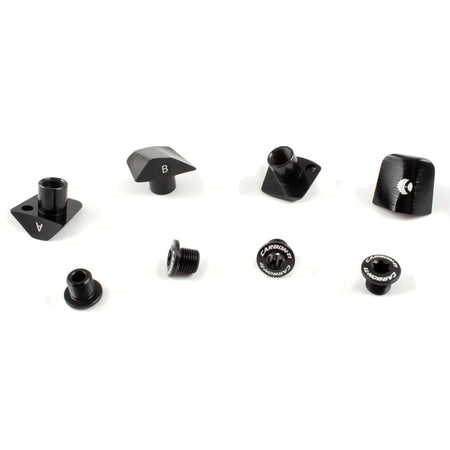 Viti fissaggio corona sagomate realizzate mediante lavorazione CNC in AL7075, kit specifico per pedivelle Shimano DuraAce 9200 12s e DuraAce 9200-P 12s. Le viti di fissaggio garantiscono una connessione solida ed elegante, oltre a un'ottima trasmissione di potenza.