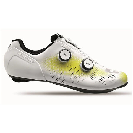 SOTTOPIEDE COMFORT IN EPS: Soletta interna anatomica con supporto dell'area tarsale per migliorare comfort ed efficienza di pedalata. Il sottopiede è perforato per un microclima ottimale all'interno della scarpa. GAERNE EPS LIGHTWEIGHT FULL CARBON SOLE 12.0 Ultra leggera e ultrasottile, la trama ottimizzata in fibra di carbonio assicura che ogni watt di potenza venga trasferito ai pedali. La stabilità del piede è aumentata grazie alla forma della suola nella zona dell'arco plantare. Quattro prese d'aria garantiscono la ventilazione all'interno della scarpa. La suola ha un inserto antiscivolo nella punta e un fondello intercambiabile nella parte posteriore. Le opzioni di posizione della tacchetta sono state aumentate di 9 mm rispetto alla suola precedente e una scala di allineamento stampata sulla suola consente di memorizzare la posizione della tacchetta.