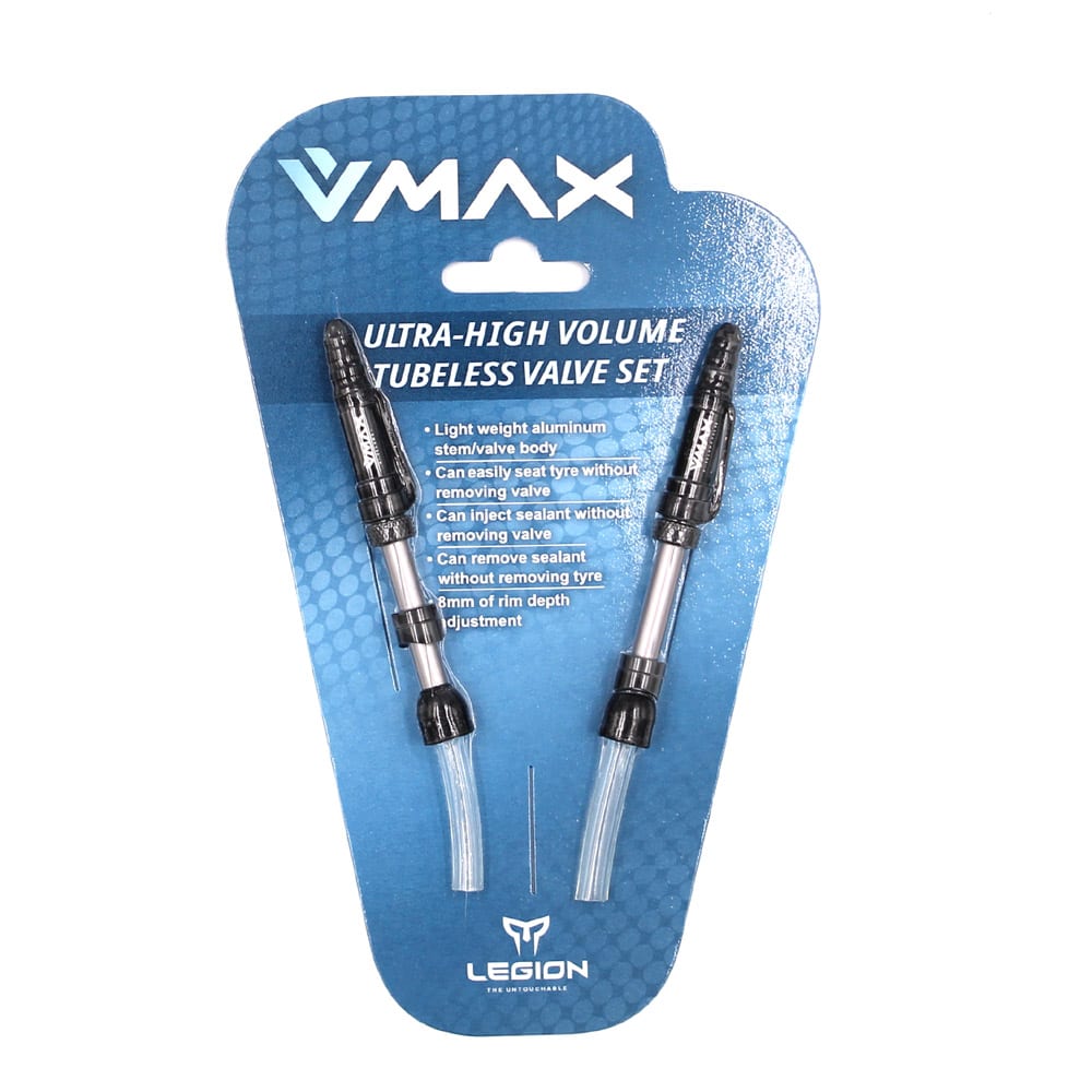 Valvole Tubeless V-MAX Lunghezza: 13-21mm Base Conica con Tubetto Tras parente in Alluminio (Blister 2 Pezzi) LEGION