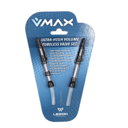 Valvole Tubeless V-MAX Lunghezza: 29-37mm Base Conica con Tubetto Tras parente in Alluminio (Blister 2 Pezzi) LEGION
